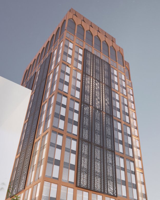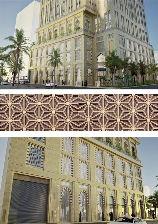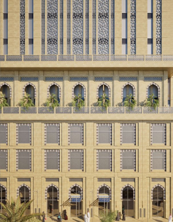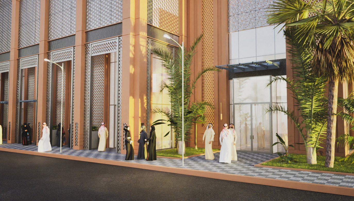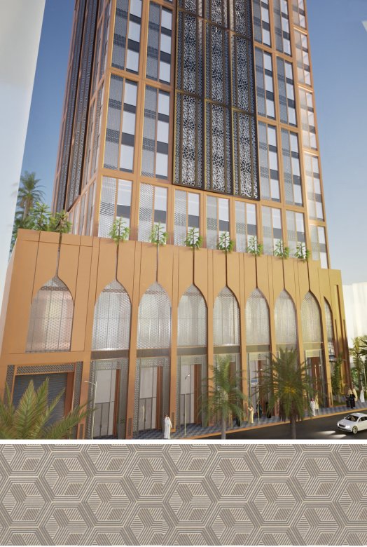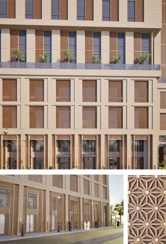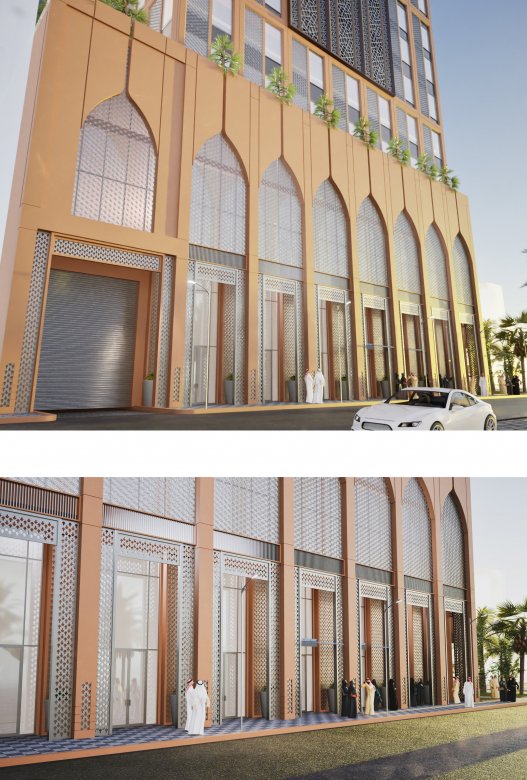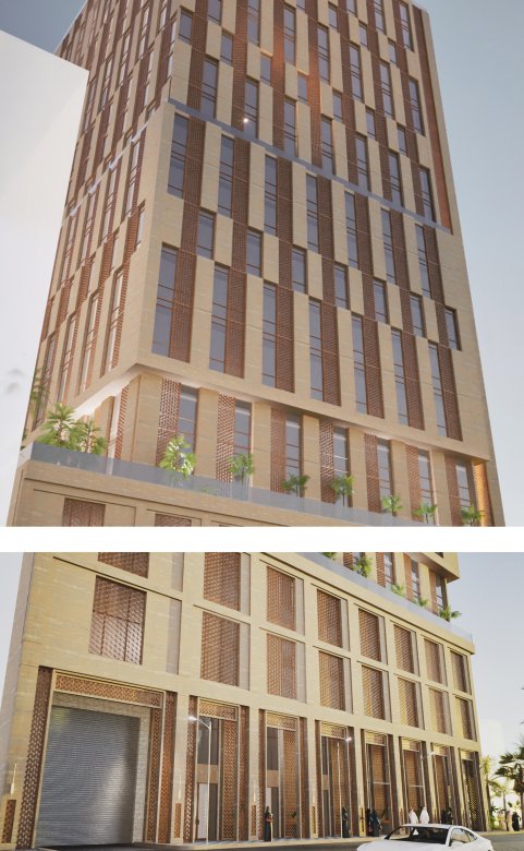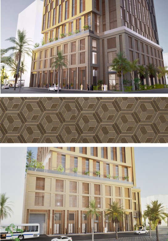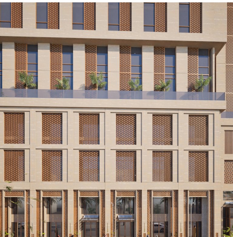 An alternative façade concept has been developed in full alignment with the MASAR project’s architectural and urban design framework. This concept emphasizes straight-formed, linear façade elements that reinforce the build-to-line principle, creating a strong and disciplined street presence while retaining flexibility for architectural expression. The façade articulation distinctly separates the building’s three primary elements—Base, Body, and Crown—utilizing varying levels of detailing in accordance with MASAR’s ‘level of play’ guidelines. The Base features pronounced straight-edged detailing to foster active human interaction at the pedestrian level, enhancing the streetscape with a clear and engaging linear form. The Body incorporates consistent straight façade planes with moderate articulation, providing visual rhythm and architectural interest that responds appropriately to its medium visibility. The Crown executes a refined, minimalist treatment with straight-line elements, offering a coherent and restrained termination to the building’s silhouette. Incorporation of traditional Islamic geometric patterns is achieved through subtle yet precise linear motifs integrated within the straight façade surfaces, ensuring cultural continuity and enriching the architectural narrative. The solid-to-void ratio is carefully balanced to prevent excessive glazing, optimizing daylight while minimizing glare and thermal gain in line with MASAR guidelines. From a massing perspective, the building expresses its volumes through well-proportioned, straight-edged Base, Body, and Crown components. Linear stepping and setbacks are employed to maintain human scale and support a pedestrian-friendly environment, while reinforcing a cohesive urban edge consistent with the district’s massing strategy. This alternative straight-formed façade concept offers a modern reinterpretation of traditional architectural elements, delivering clarity, order, and cultural resonance in harmony with the MASAR project’s vision and facade development manual.