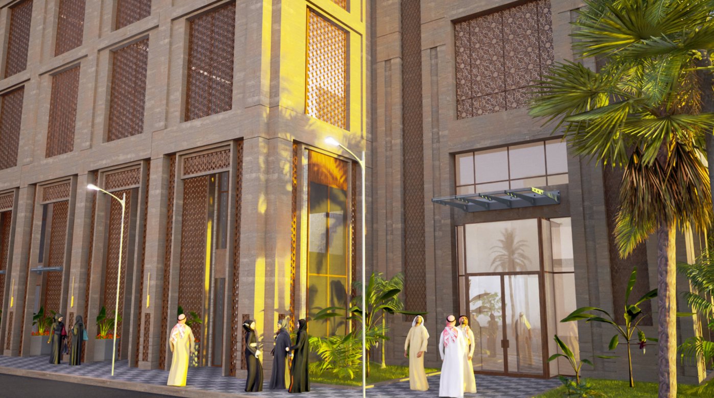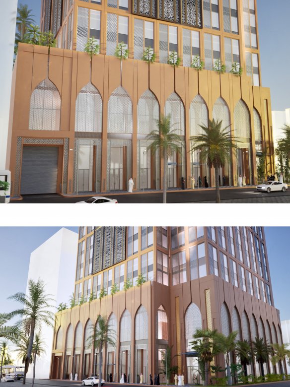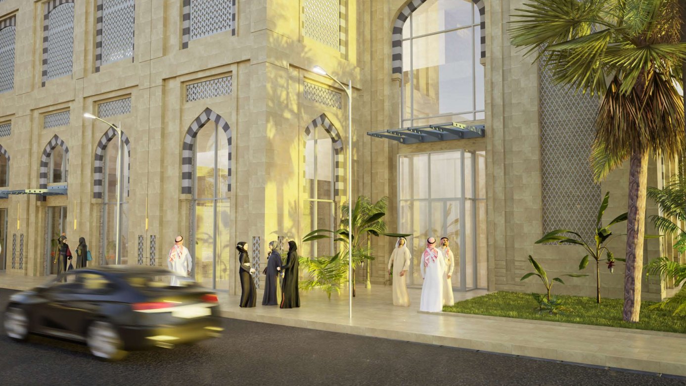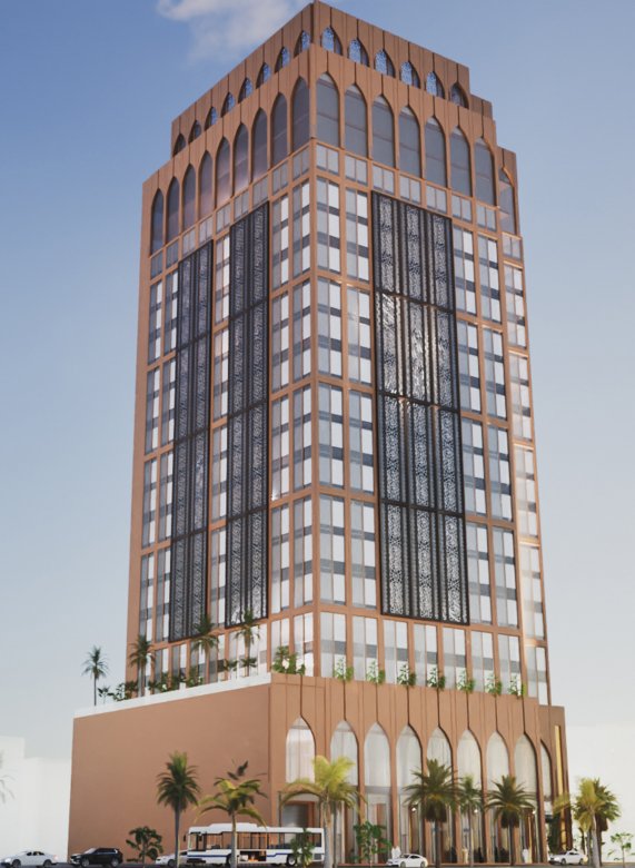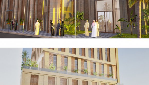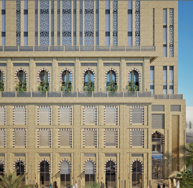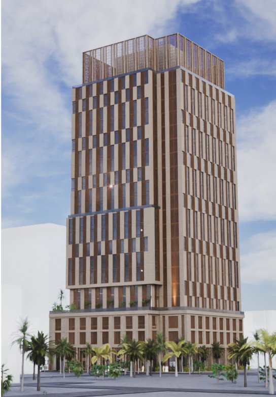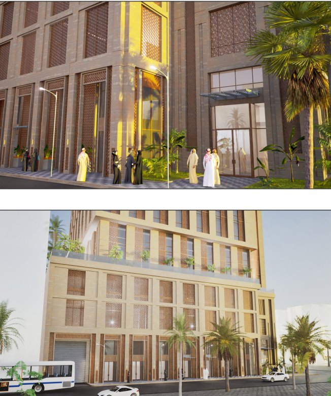 An alternative façade concept has been developed in full alignment with the MASAR project’s architectural and urban design framework. This concept emphasizes straight-formed, linear façade elements that reinforce the build-to-line principle, creating a strong and disciplined street presence while retaining flexibility for architectural expression. The façade articulation distinctly separates the building’s three primary elements—Base, Body, and Crown—utilizing varying levels of detailing in accordance with MASAR’s ‘level of play’ guidelines. The Base features pronounced straight-edged detailing to foster active human interaction at the pedestrian level, enhancing the streetscape with a clear and engaging linear form. The Body incorporates consistent straight façade planes with moderate articulation, providing visual rhythm and architectural interest that responds appropriately to its medium visibility. The Crown executes a refined, minimalist treatment with straight-line elements, offering a coherent and restrained termination to the building’s silhouette. Incorporation of traditional Islamic geometric patterns is achieved through subtle yet precise linear motifs integrated within the straight façade surfaces, ensuring cultural continuity and enriching the architectural narrative. The solid-to-void ratio is carefully balanced to prevent excessive glazing, optimizing daylight while minimizing glare and thermal gain in line with MASAR guidelines. From a massing perspective, the building expresses its volumes through well-proportioned, straight-edged Base, Body, and Crown components. Linear stepping and setbacks are employed to maintain human scale and support a pedestrian-friendly environment, while reinforcing a cohesive urban edge consistent with the district’s massing strategy. This alternative straight-formed façade concept offers a modern reinterpretation of traditional architectural elements, delivering clarity, order, and cultural resonance in harmony with the MASAR project’s vision and facade development manual.